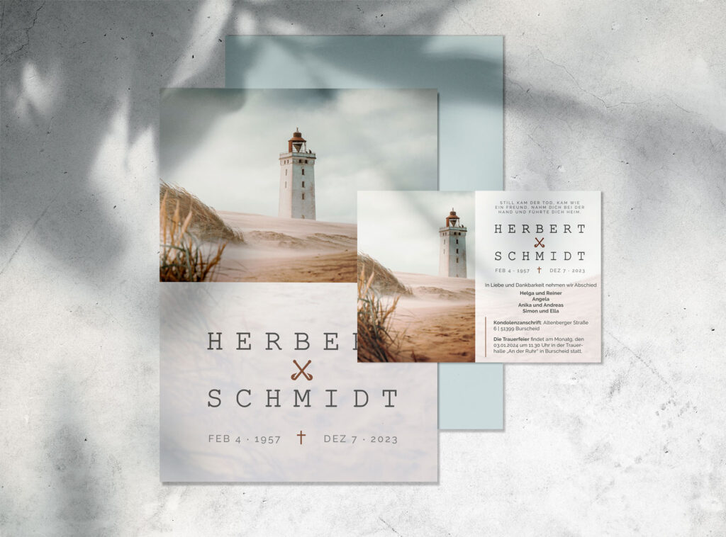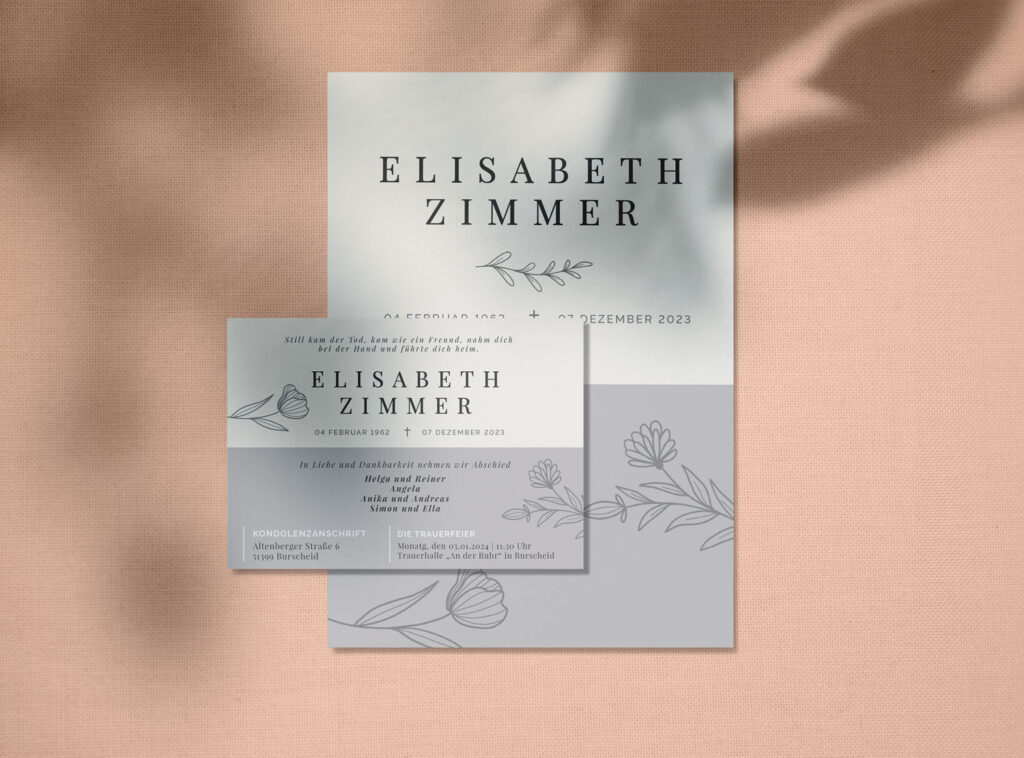 Auf Wunsch übernehmen wir die professionelle Gestaltung von Traueranzeigen, individuellen Trauerbriefen oder stimmungsvollen Danksagungen und verwandeln Ihre persönlichen Erinnerungen, Fotos und Texte in würdevolle Druckwerke – als Hommage an das Leben des Verstorbenen. Dazu gehören auch Ablaufpläne für die Gäste bei größeren Trauerfeiern. Gerne stellen wir die Traueranzeige und die Danksagung auch auf einer kostenlosen Gedenkseite online.